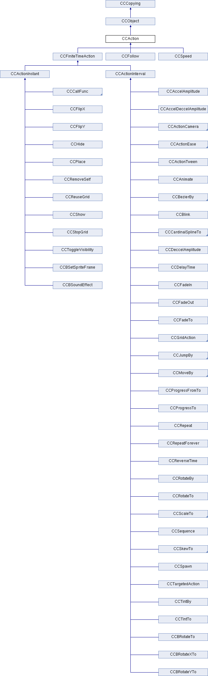 Reimplemented in CCTargetedAction, CCAnimate, CCReverseTime, CCDelayTime, CCTintBy, CCTintTo, CCFadeTo, CCFadeOut, CCFadeIn, CCBlink, CCScaleTo, CCBezierBy, CCEaseBackInOut, CCEaseBackOut, CCJumpBy, CCEaseBackIn, CCEaseBounceInOut, CCSkewTo, CCEaseBounceOut, CCEaseBounceIn, CCMoveBy, CCEaseElasticInOut, CCRotateBy, CCEaseElasticOut, CCRotateTo, CCEaseElasticIn, CCCallFunc, CCSplitCols, CCSpawn, CCSplitRows, CCEaseSineInOut, CCTwirl, CCPlace, CCJumpTiles3D, CCEaseSineOut, CCFlipY, CCBEaseInstant, CCEaseSineIn, CCWaves, CCWavesTiles3D, CCBRotateYTo, CCEaseExponentialInOut, CCBRotateXTo, CCLiquid, CCFlipX, CCEaseExponentialOut, CCTurnOffTiles, CCBRotateTo, CCDeccelAmplitude, CCShaky3D, CCEaseExponentialIn, CCBSoundEffect, CCRepeat, CCRemoveSelf, CCAccelAmplitude, CCRipple3D, CCEaseInOut, CCBSetSpriteFrame, CCCardinalSplineTo, CCToggleVisibility, CCEaseOut, CCAccelDeccelAmplitude, CCFadeOutTRTiles, CCSequence, CCOrbitCamera, CCLens3D, CCHide, CCEaseIn, CCShuffleTiles, CCFlipY3D, CCShow, CCFlipX3D, CCProgressFromTo, CCActionTween, CCShatteredTiles3D, CCActionInstant, CCActionEase, CCWaves3D, CCProgressTo, CCPageTurn3D, and CCShakyTiles3D.