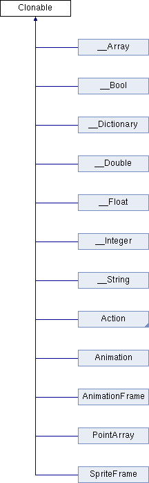 Implemented in TargetedAction, Animate, ReverseTime, EaseCubicActionInOut, DelayTime, EaseCubicActionOut, EaseCubicActionIn, TintBy, EaseCircleActionInOut, TintTo, EaseCircleActionOut, FadeOut, EaseCircleActionIn, FadeIn, EaseQuinticActionInOut, EaseQuinticActionOut, FadeTo, EaseQuinticActionIn, Blink, EaseQuarticActionInOut, ScaleBy, EaseQuarticActionOut, EaseQuarticActionIn, EaseQuadraticActionInOut, ScaleTo, EaseQuadraticActionOut, BezierTo, EaseQuadraticActionIn, EaseBezierAction, BezierBy, EaseBackInOut, JumpTo, EaseBackOut, EaseBackIn, JumpBy, EaseBounceInOut, SkewBy, EaseBounceOut, __Array, SkewTo, EaseBounceIn, MoveTo, EaseBounce, __CCCallFuncO, EaseElasticInOut, MoveBy, __Dictionary, EaseElasticOut, __CCCallFuncND, RotateBy, EaseElasticIn, CallFuncN, SplitCols, RotateTo, EaseElastic, SplitRows, EaseSineInOut, Twirl, Spawn, ReuseGrid, CallFunc, JumpTiles3D, EaseSineOut, StopGrid, Waves, CatmullRomBy, CCBEaseInstant, EaseSineIn, WavesTiles3D, DeccelAmplitude, CCBRotateYTo, Follow, CatmullRomTo, RepeatForever, EaseExponentialInOut, Place, Liquid, CCBRotateXTo, TurnOffTiles, EaseExponentialOut, AccelAmplitude, Animation, CardinalSplineBy, CCBRotateTo, FlipY, Shaky3D, FadeOutDownTiles, Speed, EaseExponentialIn, CCBSoundEffect, Repeat, AccelDeccelAmplitude, __String, FadeOutUpTiles, FlipX, CardinalSplineTo, Ripple3D, CCBSetSpriteFrame, EaseInOut, TiledGrid3DAction, FadeOutBLTiles, EaseOut, FiniteTimeAction, RemoveSelf, Sequence, FadeOutTRTiles, ActionTimeline, Lens3D, EaseIn, ToggleVisibility, PointArray, Grid3DAction, SpriteFrame, FlipY3D, ShuffleTiles, Hide, OrbitCamera, AnimationFrame, EaseRateAction, ActionInterval, FlipX3D, ProgressFromTo, Show, ActionTween, LuaCallFunc, Animate3D, ShatteredTiles3D, __Integer, ActionCamera, __Bool, Waves3D, __Double, __Float, Action, PageTurn3D, ActionEase, GridAction, ActionInstant, ProgressTo, and ShakyTiles3D.