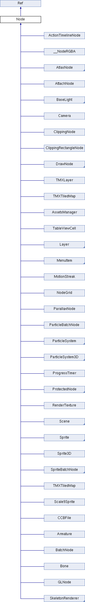 Reimplemented in Scale9Sprite, Label, EditBox, Layout, Widget, RenderTexture, ScrollView, TextFieldTTF, SpriteBatchNode, Sprite3D, ProtectedNode, ClippingNode, ParticleBatchNode, BillBoard, ClippingRectangleNode, ParallaxNode, NodeGrid, and AttachNode.