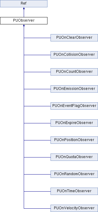 Implemented in PUOnCountObserver, PUOnRandomObserver, PUOnTimeObserver, PUOnEventFlagObserver, PUOnClearObserver, PUOnExpireObserver, PUOnPositionObserver, PUOnVelocityObserver, PUOnEmissionObserver, PUOnQuotaObserver, and PUOnCollisionObserver.