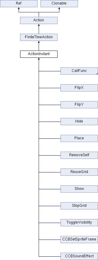 Reimplemented in __CCCallFuncO, __CCCallFuncND, CallFuncN, ReuseGrid, StopGrid, CallFunc, Place, FlipY, FlipX, CCBSoundEffect, RemoveSelf, CCBSetSpriteFrame, ToggleVisibility, Hide, LuaCallFunc, and Show.