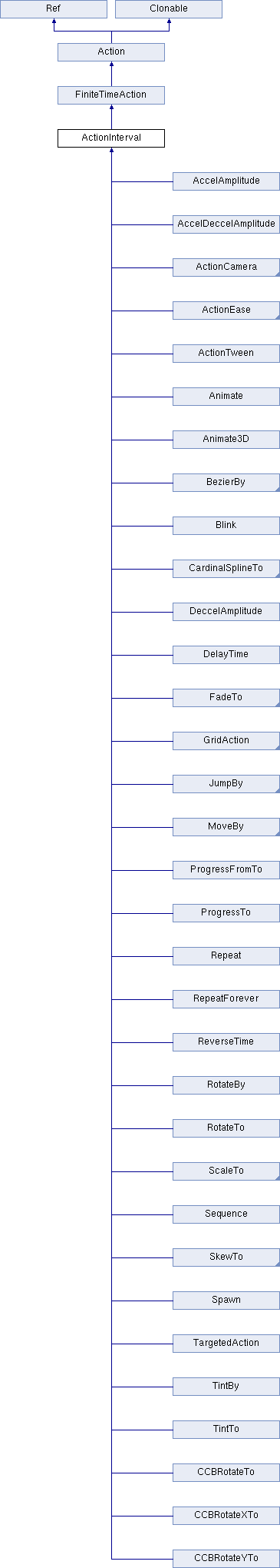 Reimplemented in TargetedAction, Animate, ReverseTime, DelayTime, TintBy, TintTo, EaseCubicActionInOut, FadeOut, EaseCubicActionOut, EaseCubicActionIn, FadeIn, EaseCircleActionInOut, FadeTo, EaseCircleActionOut, EaseCircleActionIn, Blink, EaseQuinticActionInOut, ScaleBy, EaseQuinticActionOut, EaseQuinticActionIn, EaseQuarticActionInOut, ScaleTo, EaseQuarticActionOut, EaseQuarticActionIn, BezierTo, EaseQuadraticActionInOut, EaseQuadraticActionOut, BezierBy, EaseQuadraticActionIn, EaseBezierAction, JumpTo, EaseBackInOut, JumpBy, EaseBackOut, SkewBy, EaseBackIn, EaseBounceInOut, SkewTo, EaseBounceOut, MoveTo, EaseBounceIn, EaseBounce, MoveBy, EaseElasticInOut, EaseElasticOut, RotateBy, EaseElasticIn, RotateTo, EaseElastic, EaseSineInOut, Spawn, EaseSineOut, EaseSineIn, DeccelAmplitude, CatmullRomBy, EaseExponentialInOut, RepeatForever, CatmullRomTo, AccelAmplitude, EaseExponentialOut, CCBEaseInstant, CardinalSplineBy, EaseExponentialIn, CCBRotateYTo, Repeat, AccelDeccelAmplitude, CCBRotateXTo, EaseInOut, CardinalSplineTo, CCBRotateTo, EaseOut, Sequence, EaseIn, EaseRateAction, ProgressFromTo, ActionTween, Animate3D, ActionEase, GridAction, ActionCamera, and ProgressTo.