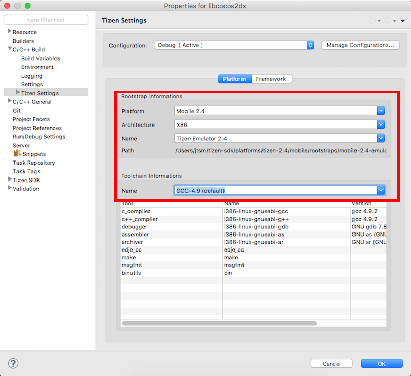 To change either Debug or Release, right click on the libcocos2d-x project and select Properties. When this window opens, select C/C++ Build -> Tizen Settings. A few items here need to be changed. Change the properties with the red boxes on the screenshot below.