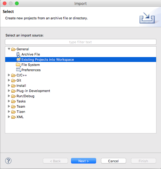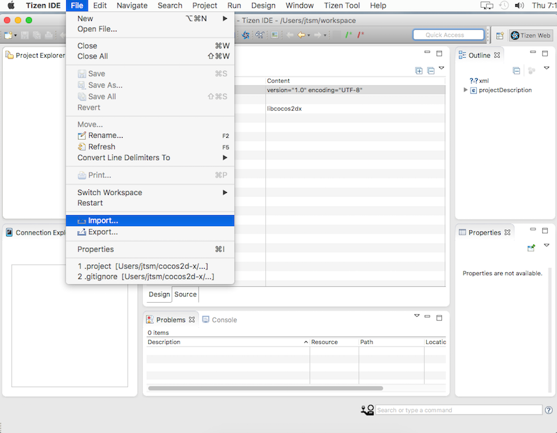 • Browse to where the Cocos2d-x root is. Then select cpp-tests and libcocos2d-x ensuring that the path for both contains proj.tizen as it is possible to import projects for Android, but we don't want to do this.