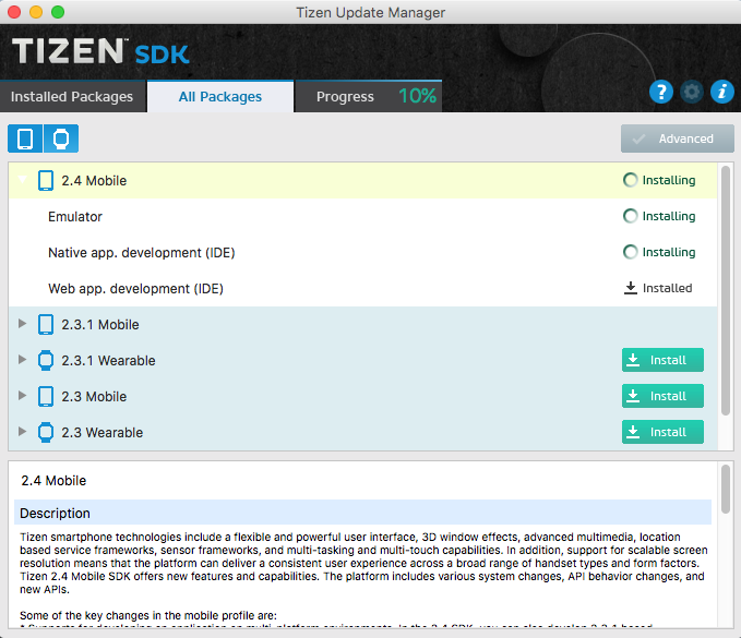 • Select 2.4 Mobile and click the down-arrow at the right side to install. If you install version 2.4, the resulting TPK could also be installed on Tizen device runs 2.3 version system. The resulting TPK is back compatible for old version devices.